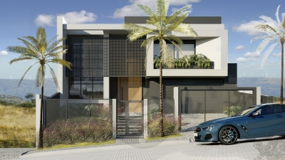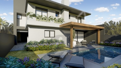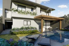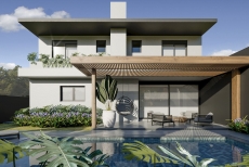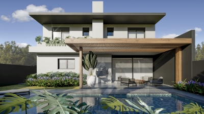 Esquadrias em alumínio preto (persiana motorizada nos dormitórios) - Pérgola em madeira, com cobertura de vidro