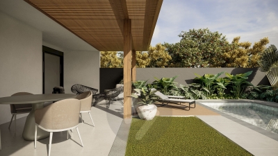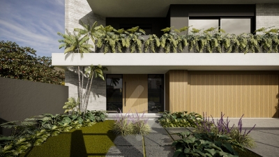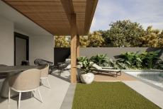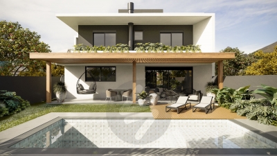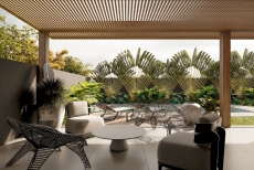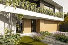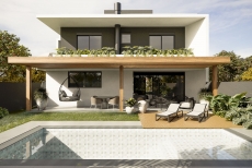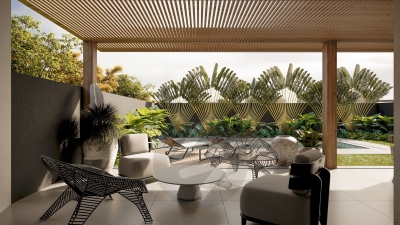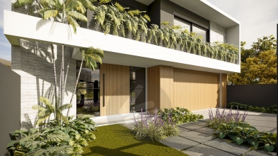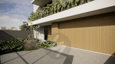 Esquadrias em alumínio preto (persiana motorizada nos dormitórios) - Pérgola em madeira, com cobertura de vidro